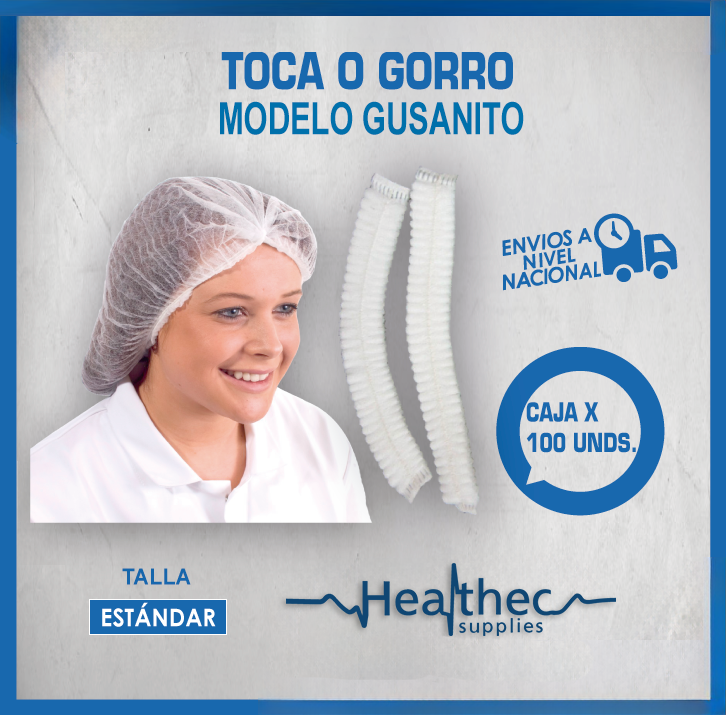 Toca o gorro descartable non woven de polipropileno modelo gusanito con doble liga, El material con el que está elaborado es de alta calidad y excelente gramaje lo que lo hace más resistente a la ruptura y/o desgarro que otros productos similares en el mercado, tiene una buena elasticidad y perfecta ventilación, es ideal para evitar contaminación por la caída de cabellos.